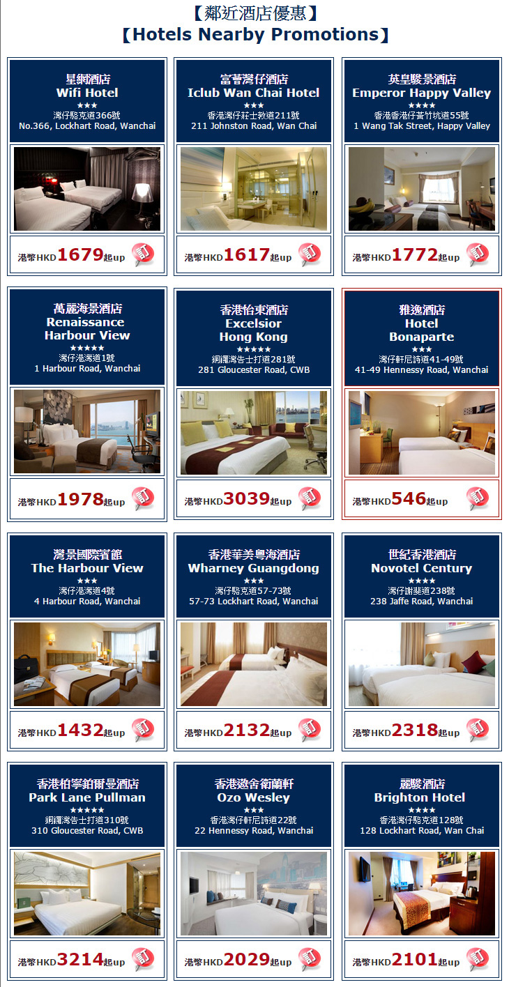 | 以上價格以每間客房計算,包括入住酒店雙人客房壹晚,所有客房並最多兩人入住。價格已含稅項,但客戶須自行承擔於住宿期間使用酒店服務所須的其他費用 | 優惠先到先得,所有預訂視乎供應情況而定 | Golden Promise保留取消任何重複或額外預訂之權利 | 以上價格只供參考,房間價格將因應實際入住日期而有所調整。實際價格將於訂房落實時確認 | 所有預訂一經確認,恕不接受任何修改或取消,包括減少入住晚數等。本公司恕不接受任何全部或部份的退款要求 | Golden Promise保留修訂、取消、擱置或更改優惠計劃的權利;優惠計劃並將可能隨時修改或取消,恕不另行通知 | Golden Promise保留最終決定權 |